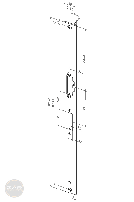 For single point mortise locks 309X, 409X, 509X and 709X.Adjustable flat repair striking plate.407.75 x 28 x 3 mm. With screw-on attachment.Universal (left-right).Stainless steel version.