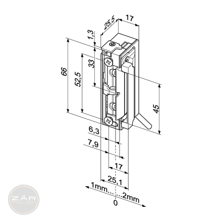 Kompaktes Türöffnergehäuse (66 x 17,5 x 25,5 mm).