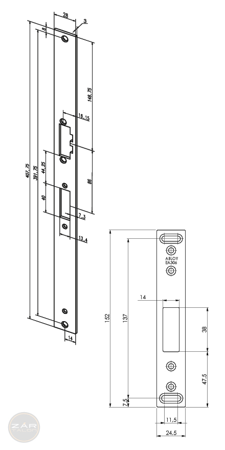 Renovierungsschließblech-Abmessungen 407,75x28x3 mm.