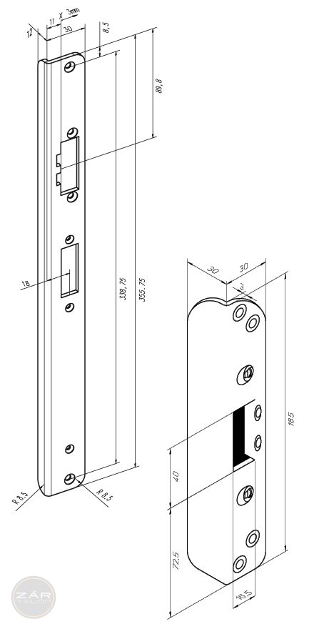 Schließblech-Abmessungen 355,75x30/12x3 mm.