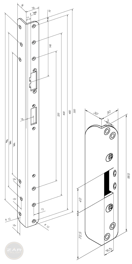 Renovierungsschließblech-Abmessungen 500x30/34x3 mm.