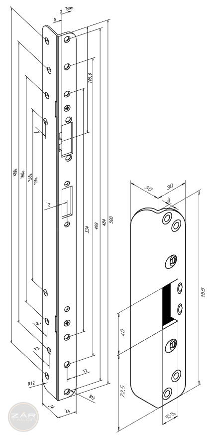 Renovierungsschließblech-Abmessungen 500x24/34x3 mm.