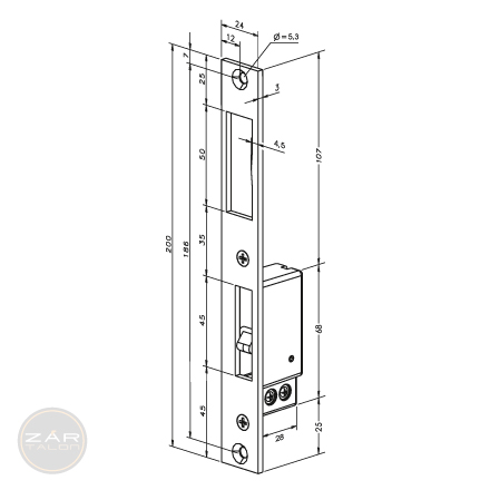 Durch die geschlossene Gehäuseform wird speziell bei Stahlzargen und Profilen der Riegelausschnitt rückseitig geschlossen. Der Profilinnenraum ist nicht sichtbar. Der Riegelschaltkontakt wird zuerst auf das Schließblech montiert, dann wird das Schließblech an der Zarge befestigt.